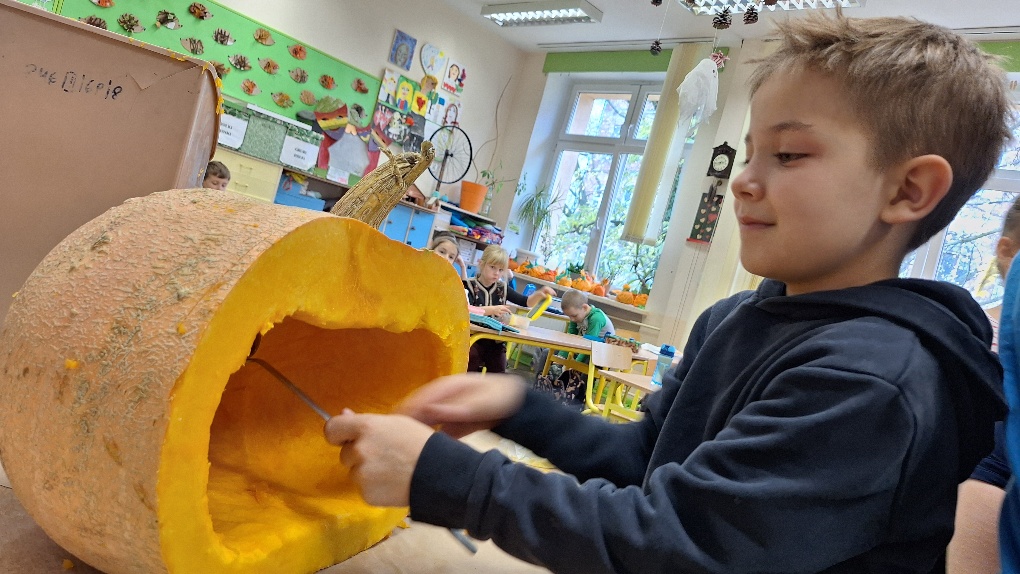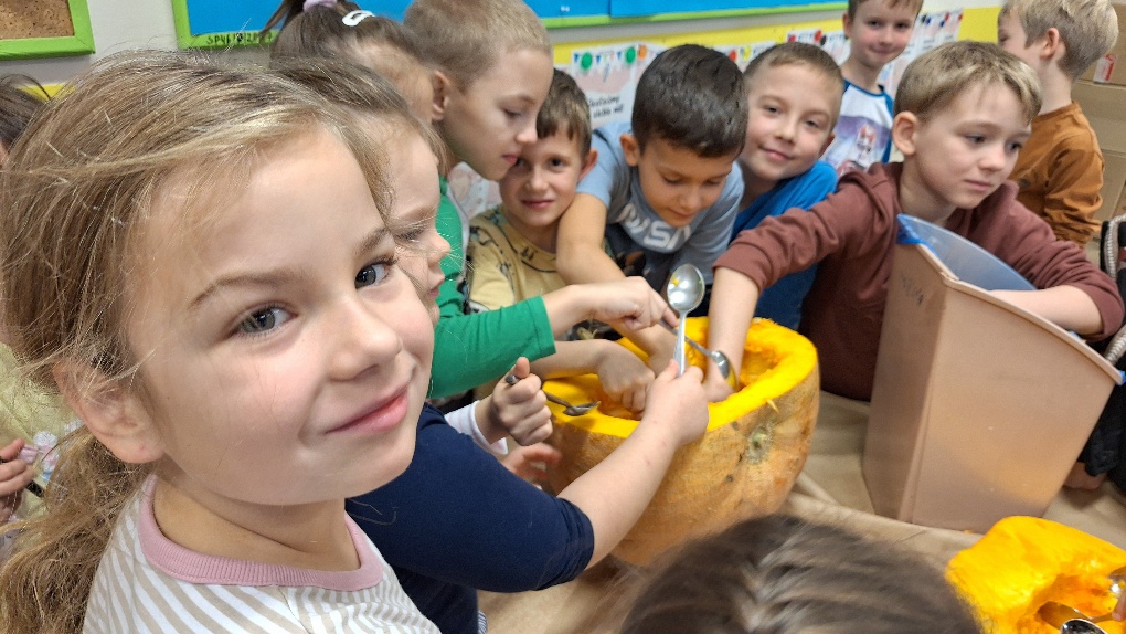 Uczniowie klasy 1a od podszewki poznali budowę dyni poprzez naprawdę odważne działanie - drążąc ją. Ależ to była zabawa.