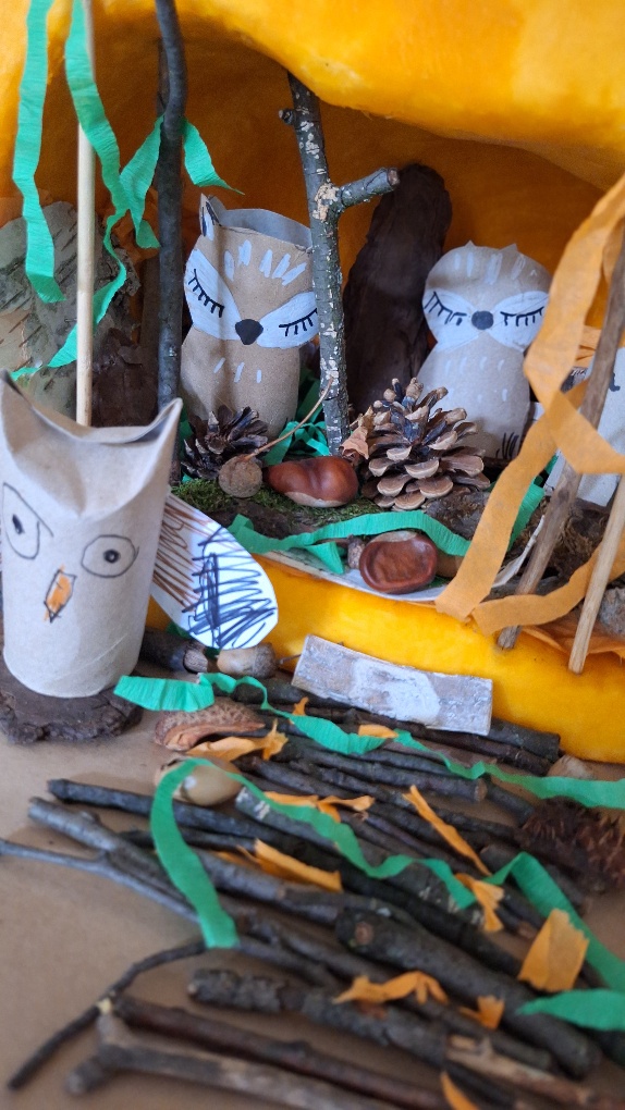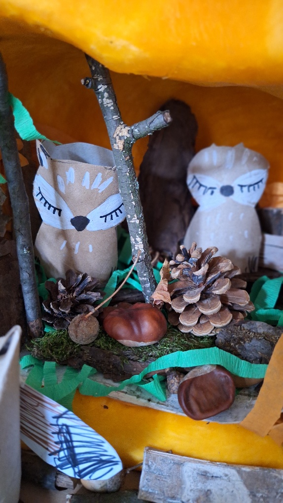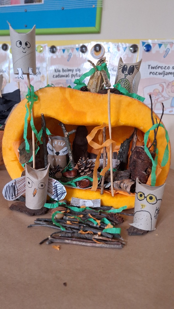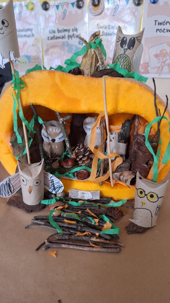Podczas zajęć, pierwszoklasiści dowiedzieli się, jakie potrawy można przyrządzać z dyni lub z dodatkiem dyni i tutaj już zupełnie inaczej wyglądały buźki dzieci, a ich oczy same uśmiechały się na myśl chociażby o dyniowych babeczkach. Ostatecznie rozkrojona i wydrążona dynia została wykorzystana do wykonania jesiennego stroika - tak oto powstał "Jesienny las ukryty w dyni".