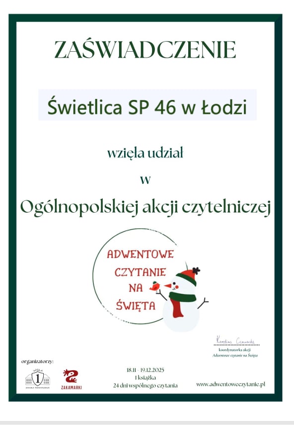 Kochani! Mamy kolejne zaświadczenie dla naszej świetlicy szkolnej SP 46 za wzięcie udziału w ogólnopolskiej akcji czytelniczej.