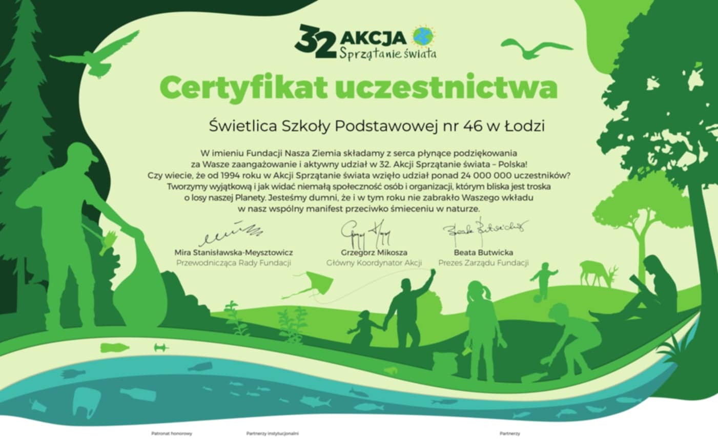 Certyfikat za udział w akcji "Sprzątanie świata".