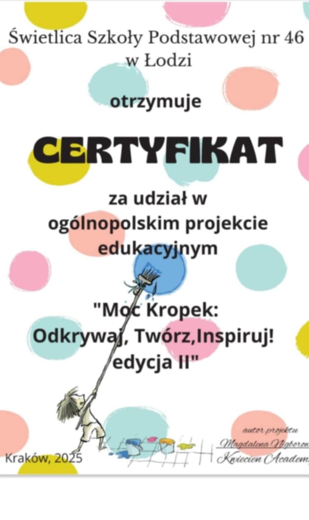 Świetliczaki! Mamy certyfikat za udział w ogólnopolskim projekcie edukacyjnym „Moc Kropek: Odkrywaj, Twórz, Inspiruj – Edycja II”. Dziś już możemy się nim pochwalić .