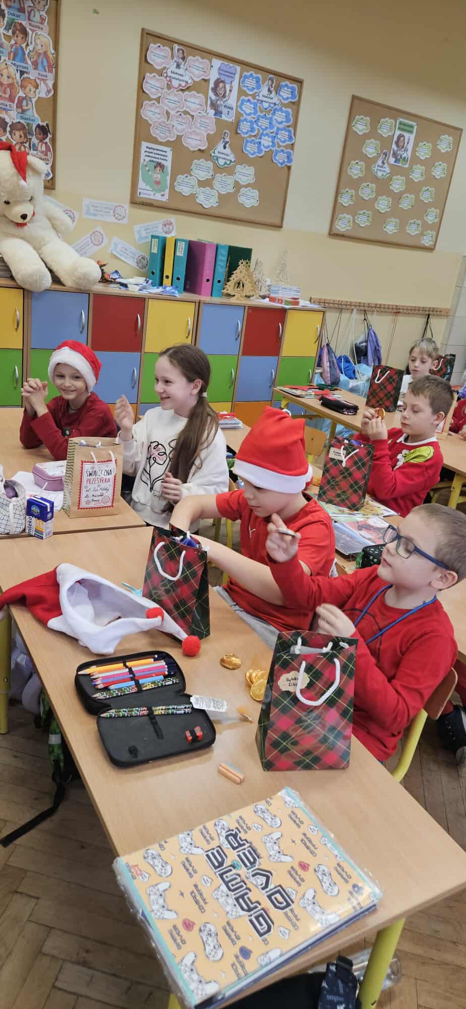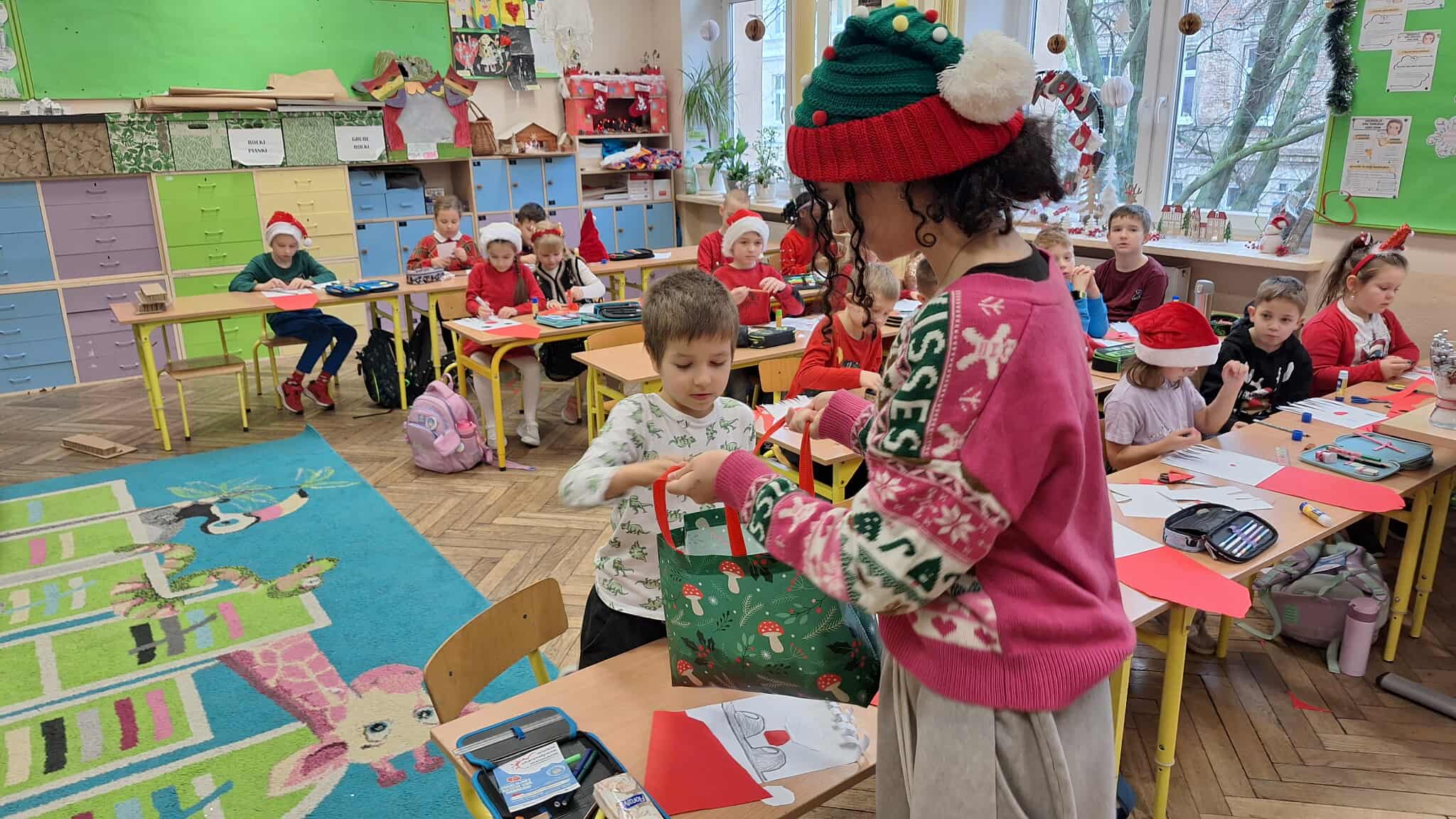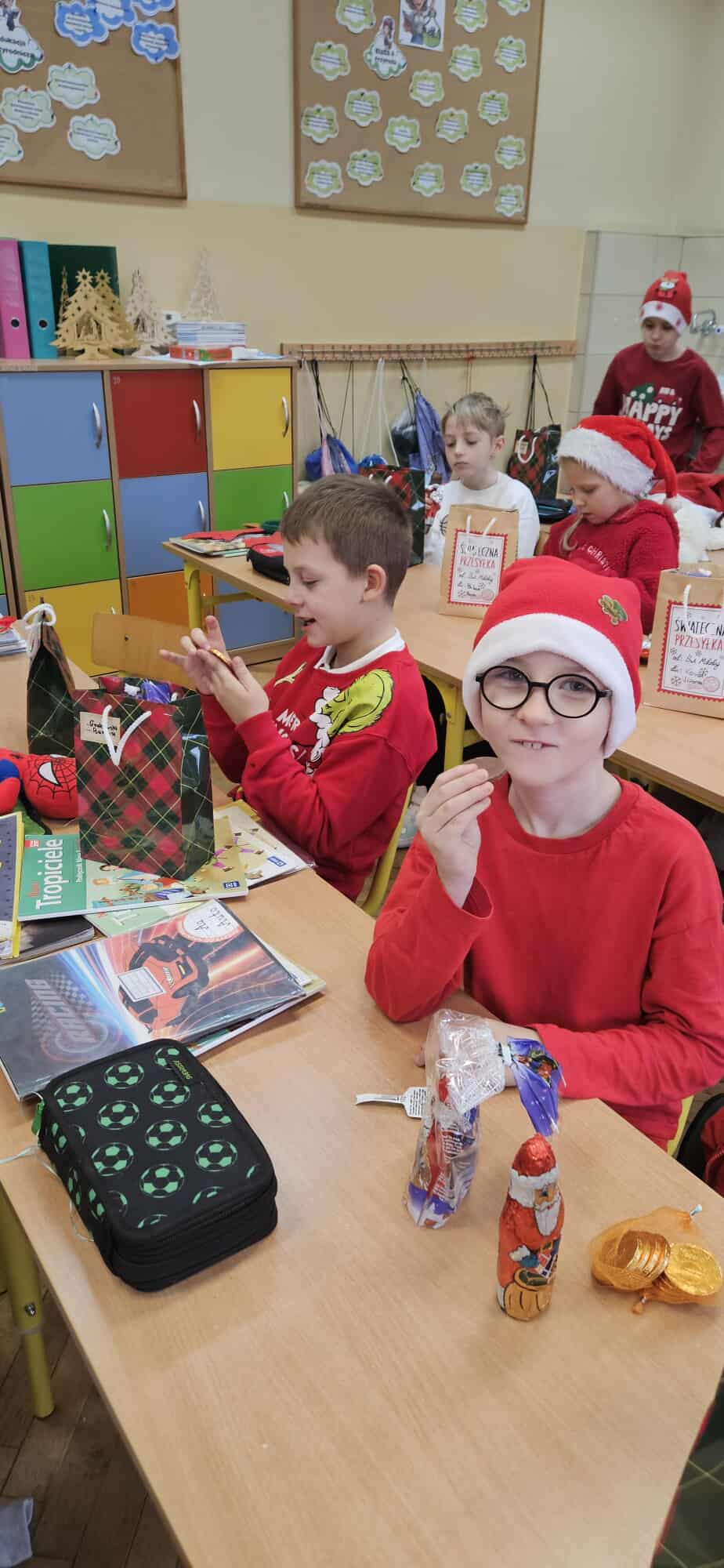 Mikołajki to jeden z takich dni, na które dzieci czekają przez cały rok! W klasach 1-3 tradycyjnie obchody te odbyły się w kuluarach sal lekcyjnych, gdzie na dzieci czekały różnorodne atrakcje. Najmłodsi uczestniczyli aktywnie we wszelakich grach i zabawach, obejrzeli filmy o tematyce mikołajkowej i oczywiście nie zabrakło kreatywnego działania w postaci prac plastycznych. Był też czas na pamiątkowe zdjęcia oraz drobne upominki. Wielką radość sprawił najmłodszym Mikołaj ze swym pomocnikiem Elfem, którzy częstowali cukierkami oraz ochoczo pozowali z dziećmi do wspólnych zdjęć.