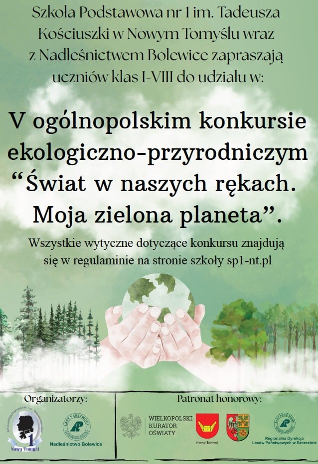 Tym razem zapraszamy Was do wzięcia udziału w V OGÓLNOPOLSKIM KONKURSIE EKOLOGICZNO - PRZYRODNICZYM „Świat w naszych rękach. Moja zielona planeta.”