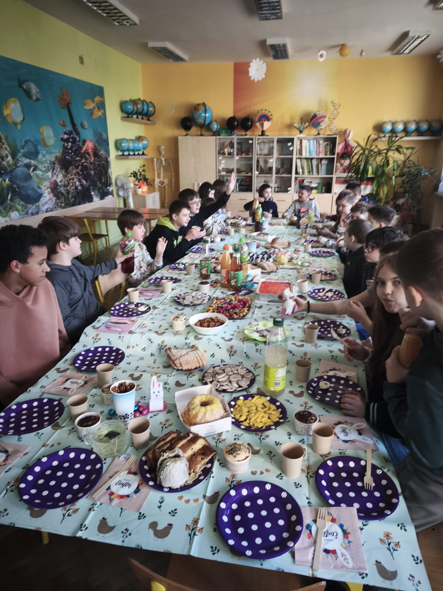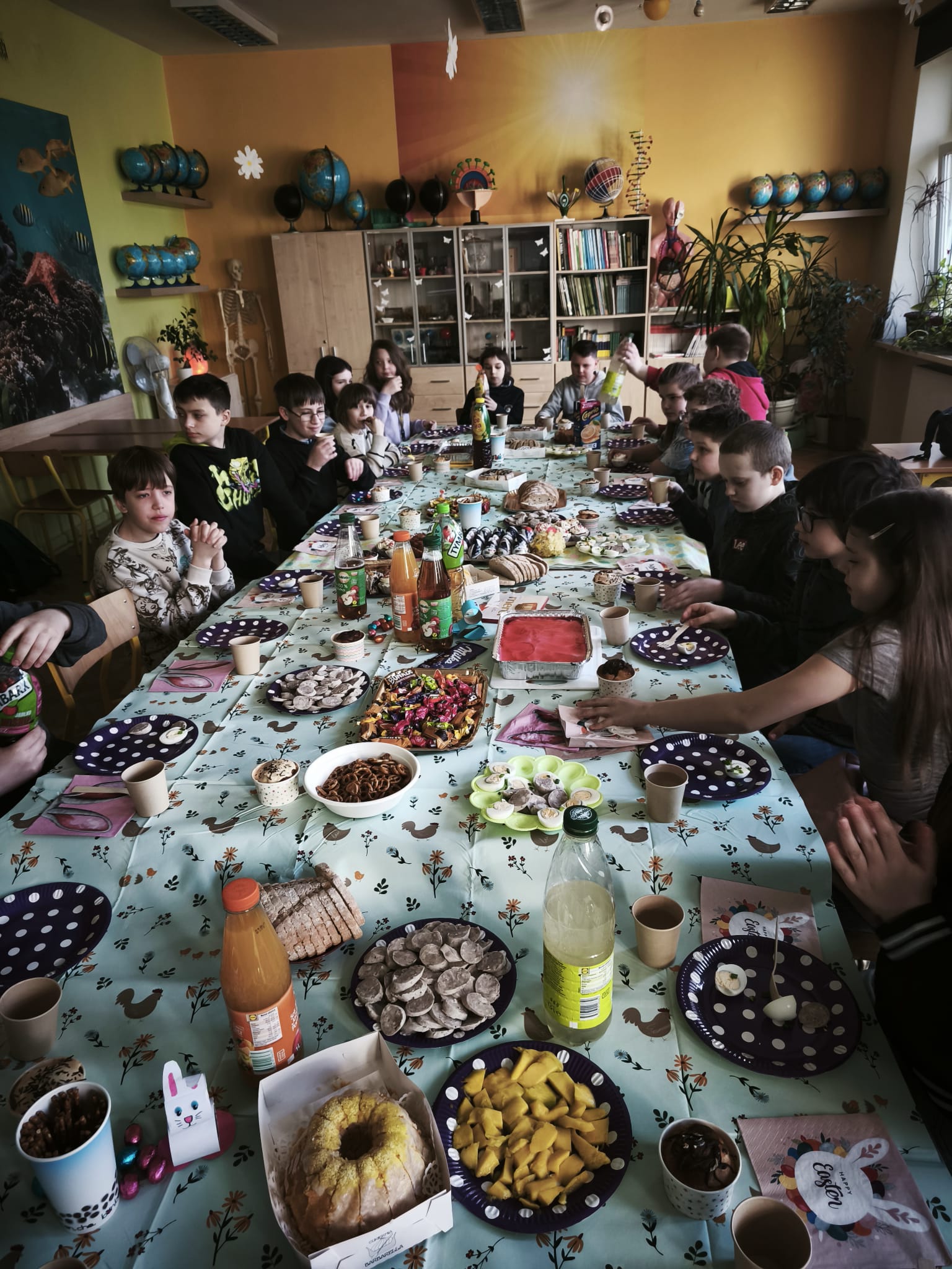 Spotkanie wielkanocne w klasie 5b to kolejna możliwość wzajemnego poznawania świątecznych tradycji, próbowania nowych potraw i smakołyków, tj. biała kiełbasa czy babka ukraińska, ale przede wszystkim możliwość bycia razem w świątecznym, wiosennym nastroju.