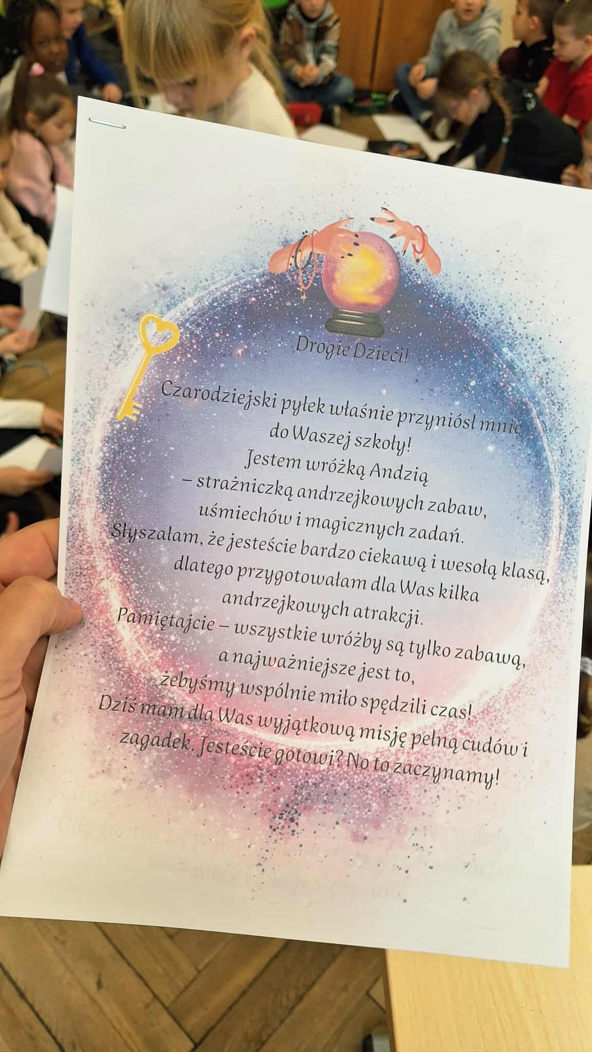 Piątek 28 listopada w edukacji wczesnoszkolnej przebiegał pod hasłem wróżb i zabaw andrzejkowych. Już od samego rana, sale najmłodszych uczniów zamieniły się w miejsce czarów i magii. Każdy uczestnik andrzejkowych szaleństw z niecierpliwością losował swoją wróżbę. Katalog wróżb był obszerny i bogaty, a każdy pragnął wywróżyć sobie coś wyjątkowego. Uczniom klasy 1a Wróżka Andzia przekazała w liście kilka szczególnych słów, a w klasach trzecich zabawy andrzejkowe zakończyły się na wspólnym poczęstunku w postaci pizzy.