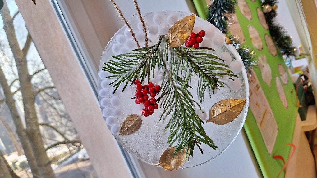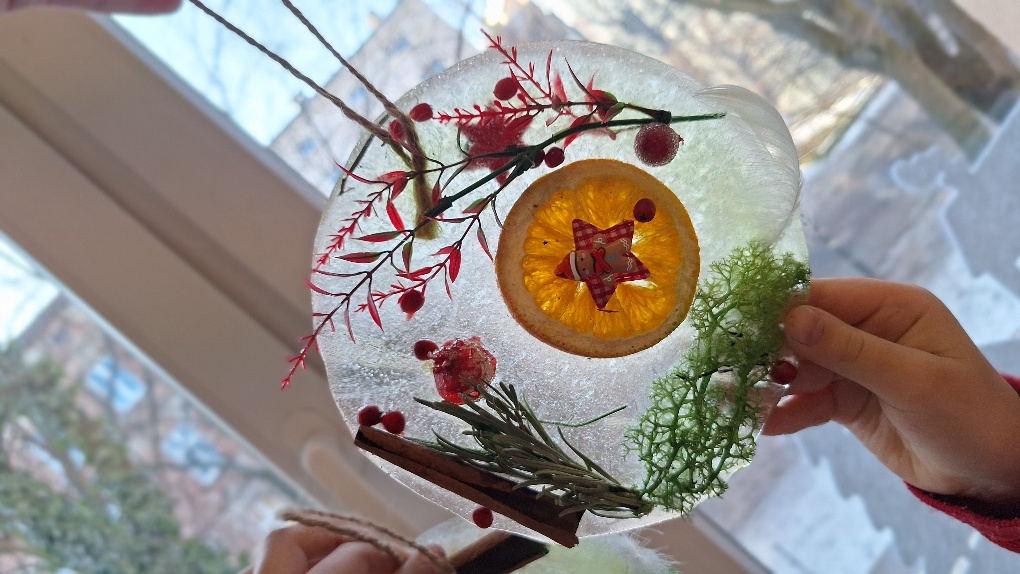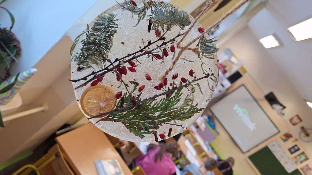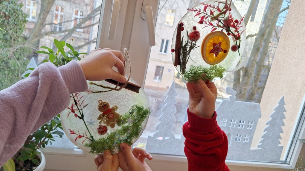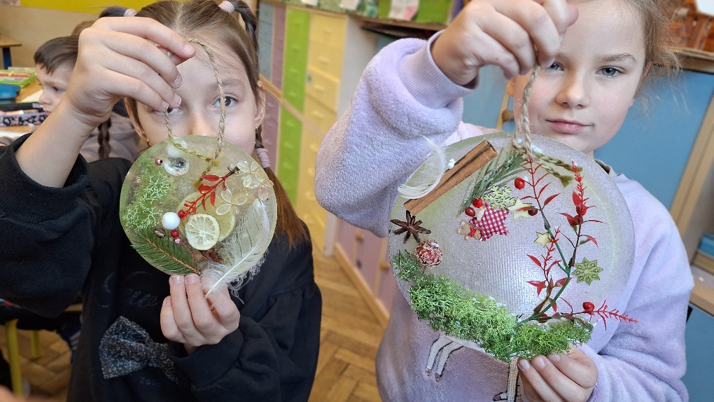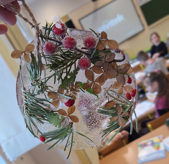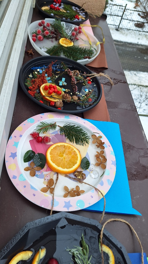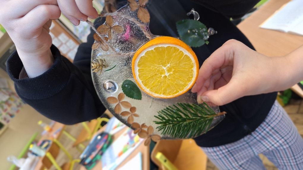 W ostatnim czasie pierwszoklasiści stworzyli lodowe witraże, które nawiązują do land artu (land art - sztuka ziemi; obszarem działania jest tu szeroko pojęta przestrzeń ziemi, środowiska naturalnego). Tuż przed weekendem dzieci przygotowały solidny materiał pod wspomniane witraże, a wykorzystali do tego celu m.in.: kwiaty, liście, gałązki, małe szyszki, plasterki owoców, liść laurowy i goździki, laski cynamonu, gwiazdki anyżu i inne części roślin oraz okrągły plastikowy pojemnik, wodę, sznurek, nożyczki i…i oczywiście mróz!