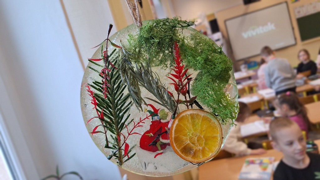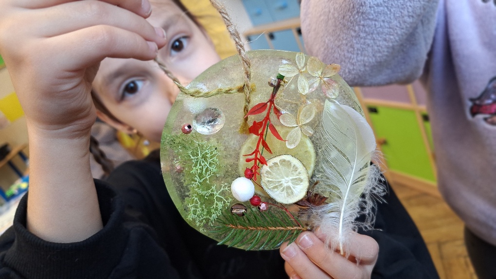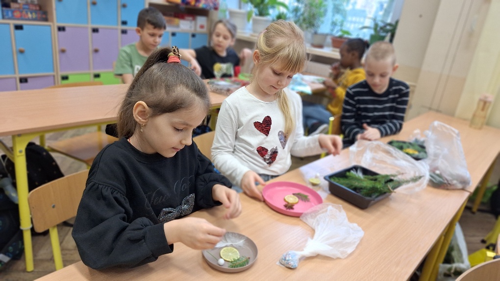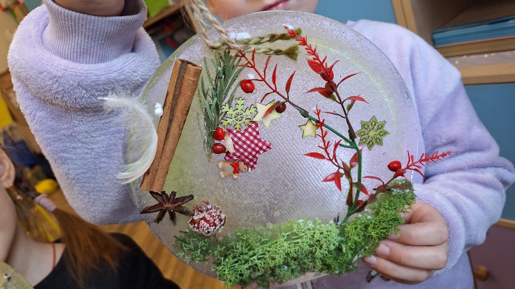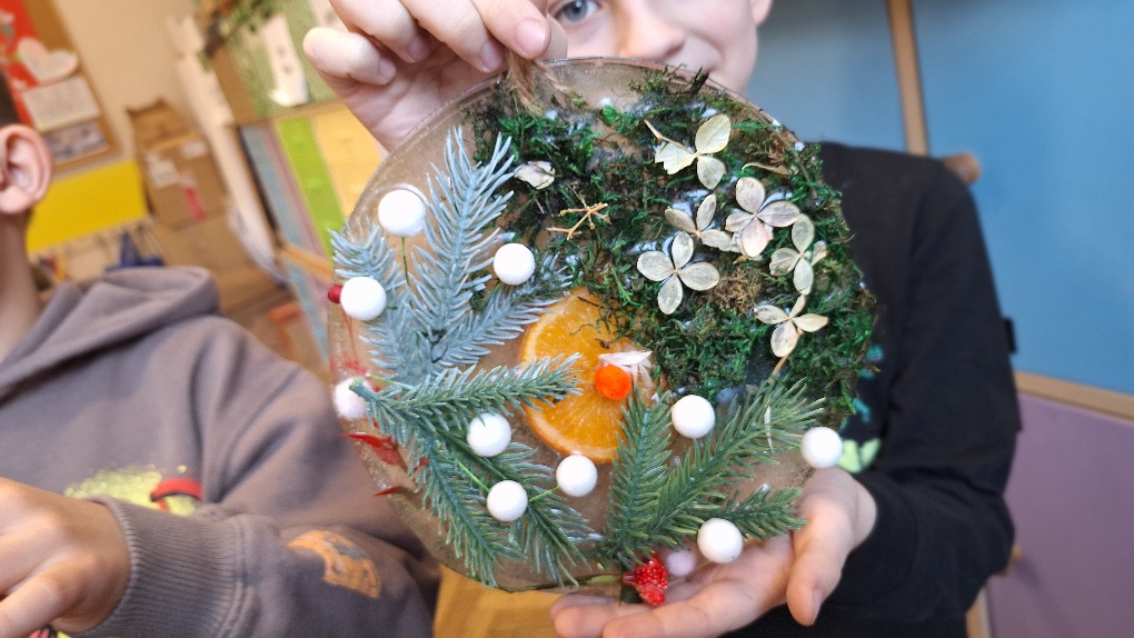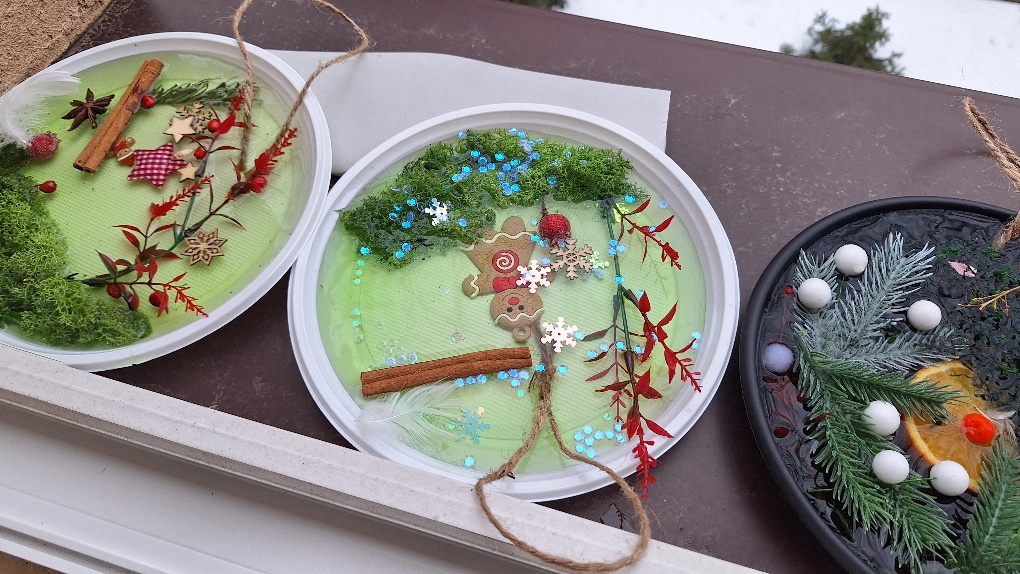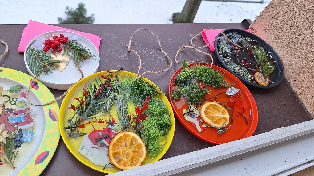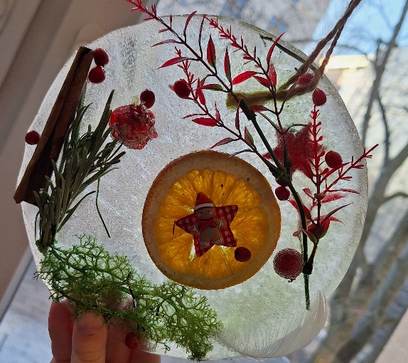 W ostatnim czasie pierwszoklasiści stworzyli lodowe witraże, które nawiązują do land artu (land art - sztuka ziemi; obszarem działania jest tu szeroko pojęta przestrzeń ziemi, środowiska naturalnego). Tuż przed weekendem dzieci przygotowały solidny materiał pod wspomniane witraże, a wykorzystali do tego celu m.in.: kwiaty, liście, gałązki, małe szyszki, plasterki owoców, liść laurowy i goździki, laski cynamonu, gwiazdki anyżu i inne części roślin oraz okrągły plastikowy pojemnik, wodę, sznurek, nożyczki i…i oczywiście mróz!